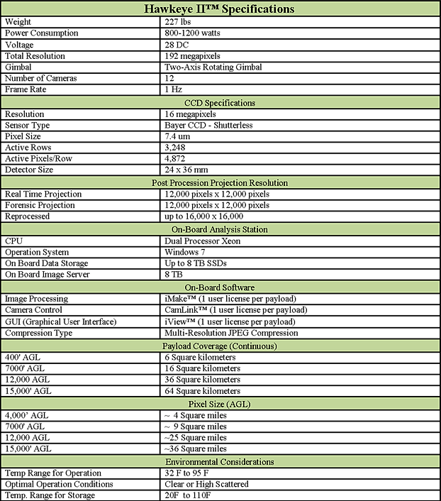 HawkEye II es un sensor de alta capacidad. El sistema básico consiste de doce cámaras, todo color, una Unidad de Medición Inercial, y (universal Mount) de dos ejes. Este sistema está diseñado para mirar desde la puerta de equipaje del avione.
