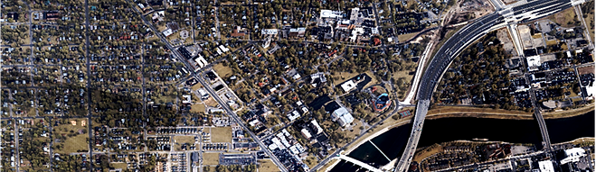 La imagen representa un avión con el sensor aerotransportado en órbita sobre un área de interés. El círculo de trazos debajo de la órbita representa los límites del área de cobertura del sensor. La línea roja indica lo que una cámara tradicional sería capaz de ver, mientras que los cuadrados amarillos representan varias áreas de interés que pueden ser monitoreados simultáneamente por la área amplia del sensor.